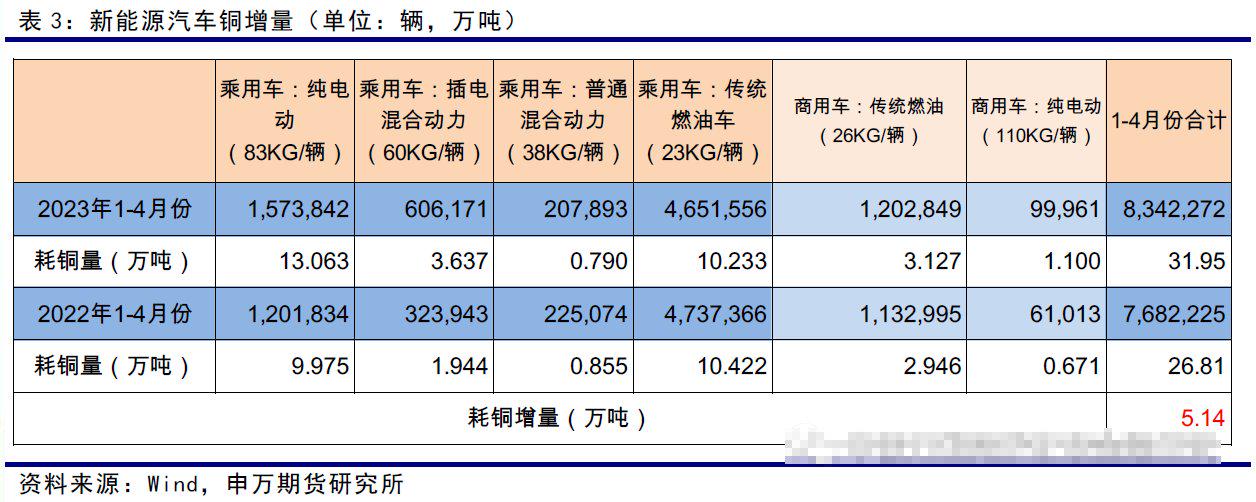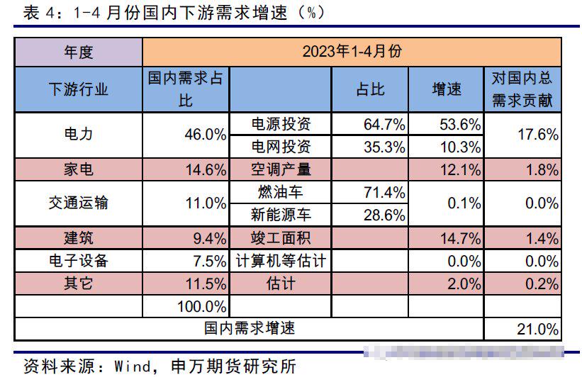 1-4月份国内新能源汽车产销分辩完成229.1万辆和222.2万辆,同比均增长42.8%。4月份新能源汽车浸透率达到30%。汽车出口保握高增长,4月份出口同比增多166%,占国内月度产量的17.6%,出口增多弥补了国内需求的下滑。新能源浸透率和出口的提高正经了国内交通确立行业的铜需求。在本年产量同比下落5%等假定前提下,与客岁比较铜需求量基本握平。