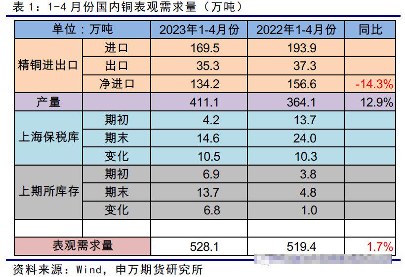 由1-4月份的数据来看,国内产量赫然增多,入口同比出现下落,国内上期所和保税库库存算计出现下落,国内表不雅需求量(供应)同比基本握平,仅增多1.7%。