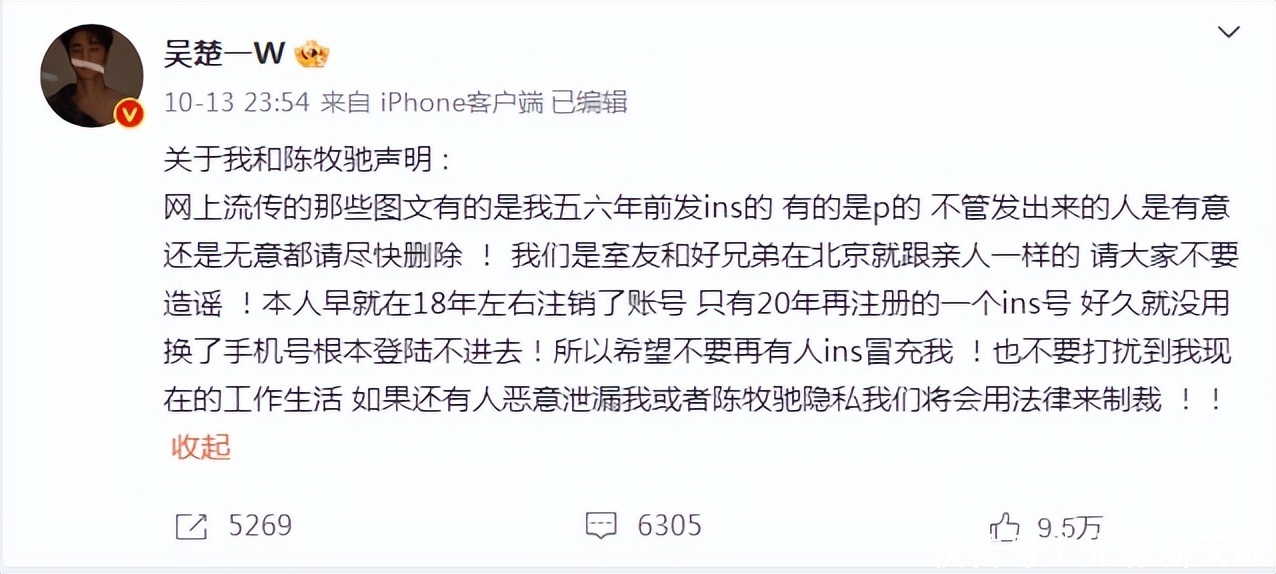 上个月,有网友晒出陈牧驰和吴楚一的连络黑料,10月13昼夜深,吴楚一发表声明,称网崇高传的图文是他五六年前在外网发布的本体,有一些是坏心P图,但愿网友能尽量删除。并暗示他和陈牧驰是室友和好昆玉,在北京就跟亲东说念主雷同,请寰球不要贬抑。