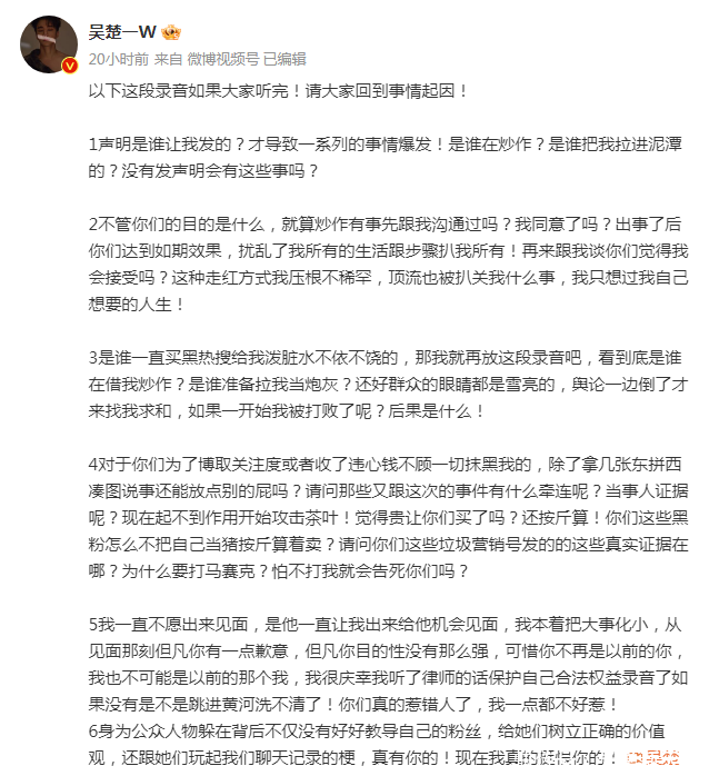 吴楚一发这段灌音,是想阐明我方在这场公论风云中一直处于被迫的景色,并不是他想炒作,相背,我方被拉进泥潭、生计被干涉,还被买黑热搜、被泼脏水、被当成填旋。皆集这段灌音,吴楚一也发了一篇长文,文中列出6点,终末一句话是喊话陈牧驰“当今我确切挺恨你的!”