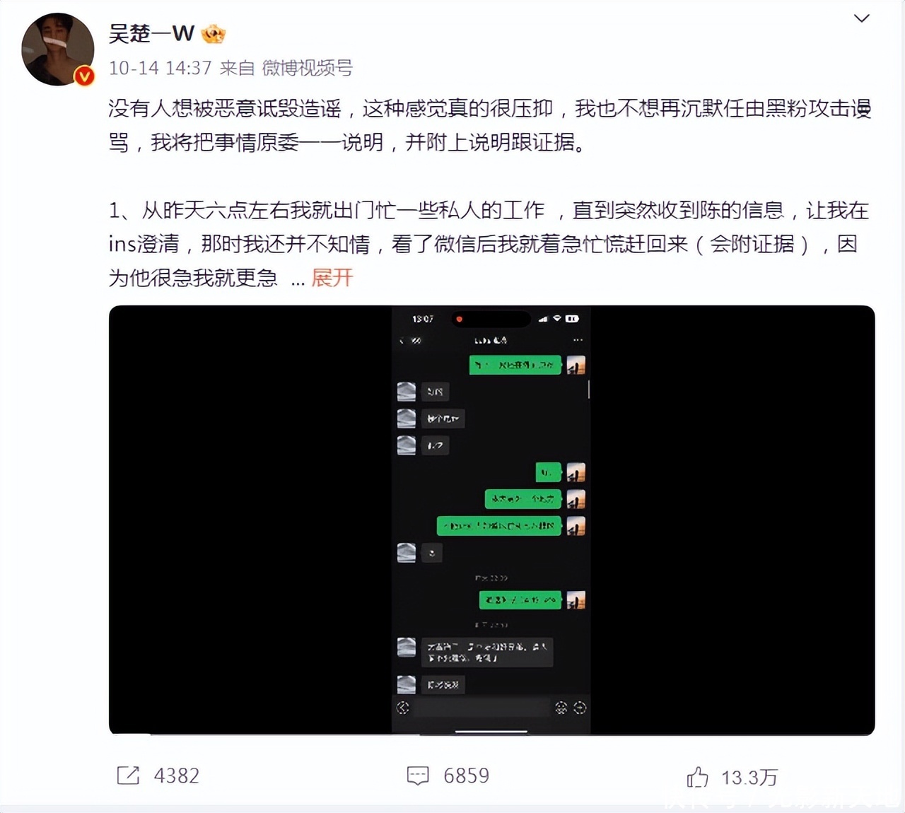 接着10月14日,吴楚一再次发表长文和聊天记载录屏,称黑料与我方无关,判辨是为了归附真相,莫得受到失当利益驱使。而关于陈牧驰,则开动有了恼恨,吐槽对方“微信班师不回、对我换了作风”,而我方之前还在他经济遭逢费事时帮过他。