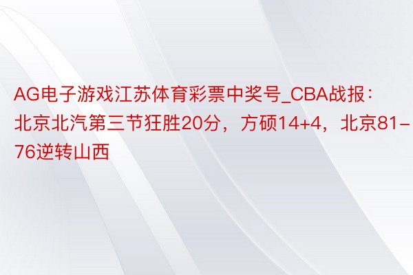 AG电子游戏江苏体育彩票中奖号_CBA战报:北京北汽第三节狂胜20分,方硕14+4,北京81-76逆转山西
